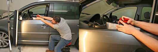 Mit einer speziellen Fixierlampe wird die Delle ins rechte Licht gesetzt. Eine Schutzscheibe wird in den Fensterschacht als Scheibenschutz eingeführt. Mit dem Drückwerkzeug wird von der Innenseite her die Delle gehebelt und massiert.